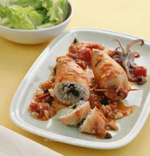 4. Γεμίζετε ένα ένα τα καλαμαράκια (μην τα παραγεμίσετε) και κλείνετε το άνοιγμα με μια οδοντογλυφίδα.