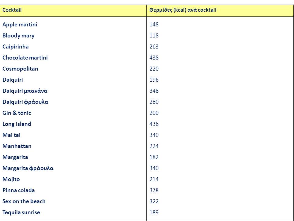 Στον παρακάτω πίνακα αναφέρονται οι θερμίδες ορισμένων πολύ γνωστών και αγαπητών από πολλούς cocktails.