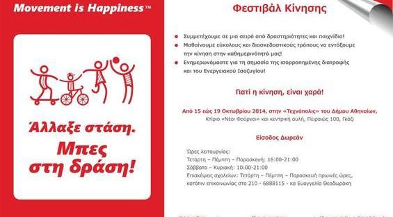 Το Φεστιβάλ Κίνησης «Άλλαξε στάση. Μπες στη δράση!» έχει σκοπό να δείξει σε όλους μας εύκολους και διασκεδαστικούς τρόπους ώστε να εντάξουμε την κίνηση στην καθημερινότητά μας! Στις 5 μέρες που θα διαρκέσει το Φεστιβάλ, μικροί και μεγάλοι θα έχουν την ευκαιρία με βιωματικό τρόπο να λάβουν μέρος σε μια σειρά από δραστηριότητες και παιχνίδια και να ενημερωθούν για τη σημασία της κίνησης, της ισορροπημένης διατροφής και του Ενεργειακού Ισοζυγίου από επιστήμονες από το χώρο της άσκησης και της διατροφής. Το Φεστιβάλ θα είναι ανοιχτό στο κοινό, με δωρεάν είσοδο για όλους.